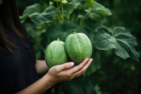 Beautiful woman standing in front of a Chayote plant in a vegetable garden, holding a freshly picked Chayote fruit in her hand