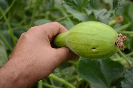 closeup green ripe round gourd hold hand growing with leaves and vine in the farm.