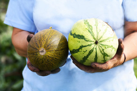 Little melon and watermelon. Dirty hands of a man working in the garden. Man holding a ripe little melon and watermelon.