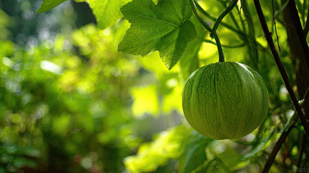 A detailed photograph of a single Galia melon, swaying gently in the wind, captured in natural daylight. Fresh and airy atmosphere, soft motion blur on leaves, crisp details on textures, background softly blurred into natural greenery, cinematic natural light, realistic photography.