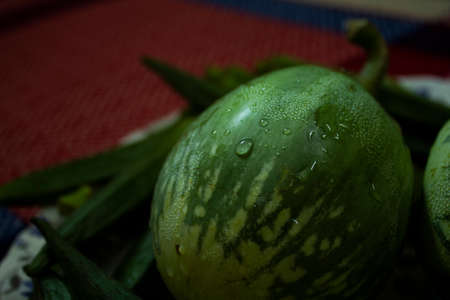 Cucumis anguria, cackrey, maroon cucumber, West Indian gherkin and West Indian gourd. Deco-Fruits yellow and green colors. Front view.