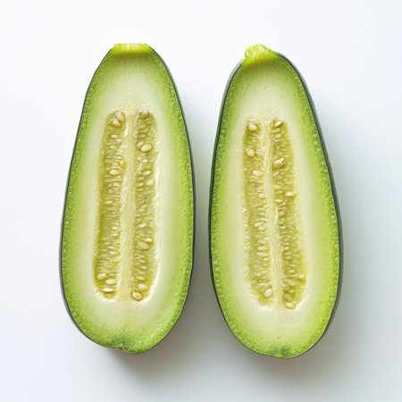 A fresh zucchini cut in half, isolated on a white background, showing a versatile vegetable option