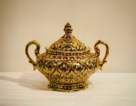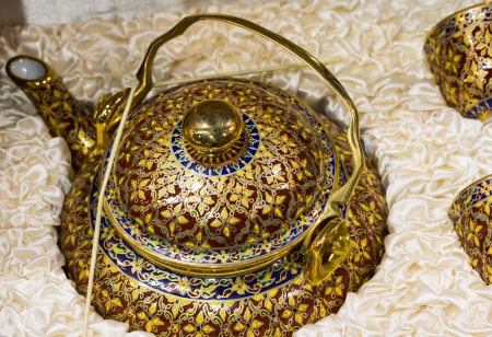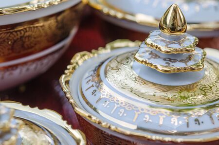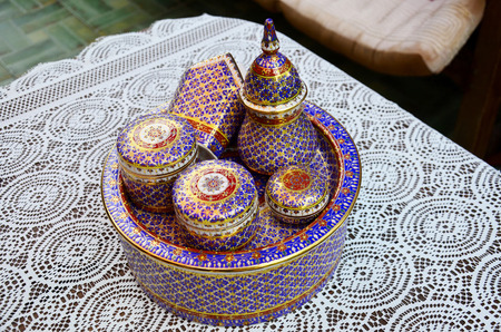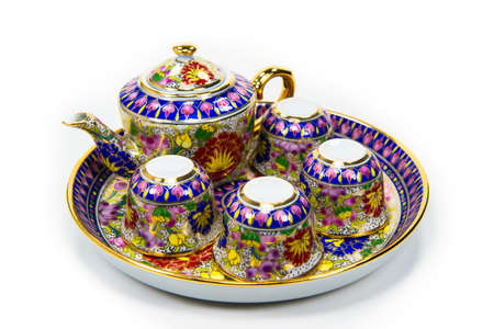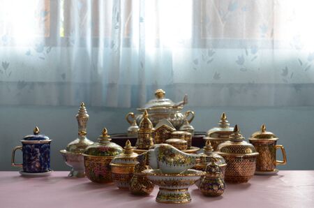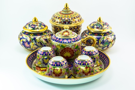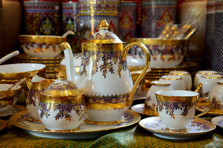 Antique Benjarong porcelain golden tea set on Stone table, ceramics porcelain