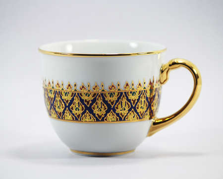 Thai porcelain teacup with gold rim and floral patterns on white background, perfect for heritage, tea culture, and design mockups.