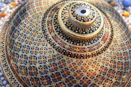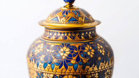 A stunning close-up of an intricate decorative design showcasing vibrant blue and gold accents, highlighting exquisite craftsmanship and artistic beauty.