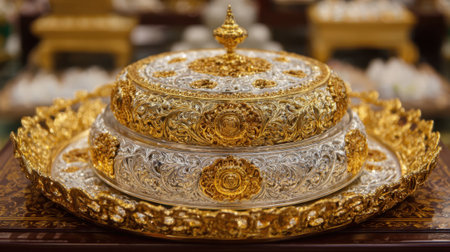 A stunning golden bowl set adorned with detailed designs sits on a wooden showcase. The vibrant colors and intricate carvings attract visitors at a bustling market.