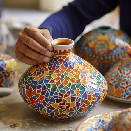 a woman arranges vibrant dishes on a table, creating a mosaic-like display. the meticulous linework and precision showcase the handcrafted designs of these decorative vessels. captured on kodak ektar 100 film, the photo captures the realistic details of the colorful dishes. ai generated