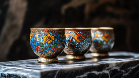 This image showcases three beautifully crafted decorative cups with intricate floral designs, resting on a polished marble surface, perfect for artistic displays.