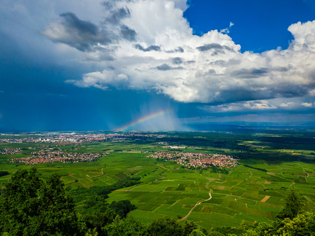Aerial panoramic view of the rainbow over the green valley, Alsace, France