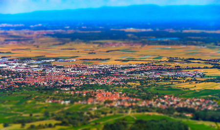 Beautiful tilt-shift aerial view to the colorful valley from the top of the hill, Alsace, France