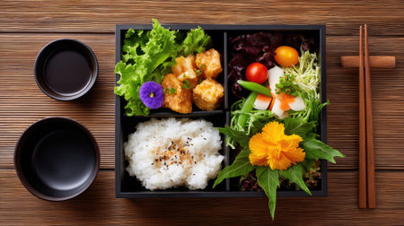 A vibrant bento box featuring sushi, tempura, and fresh salad. Ideal for a fulfilling meal, showcasing the beauty and variety of Japanese cuisine.