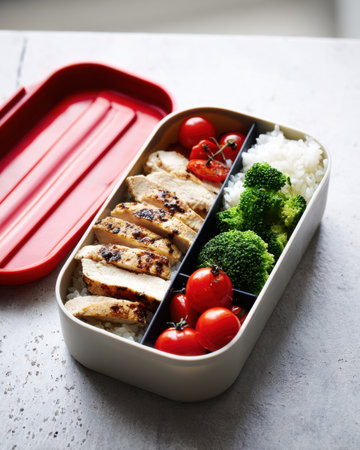 Open divided bento with red lid on the side, grilled chicken, rice, broccoli and tomatoes, organized portioned meal concept.