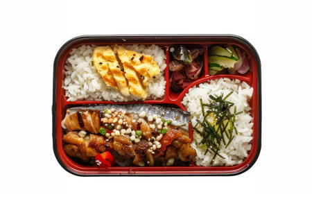 Healthy and delicious bento box lunch with grilled meat, rice, vegetables, and fruit