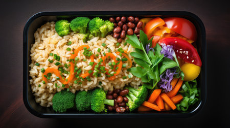 A visually appealing bento box featuring a variety of fresh ingredients, including grains, vegetables, and proteins, perfect for a nutritious meal option.