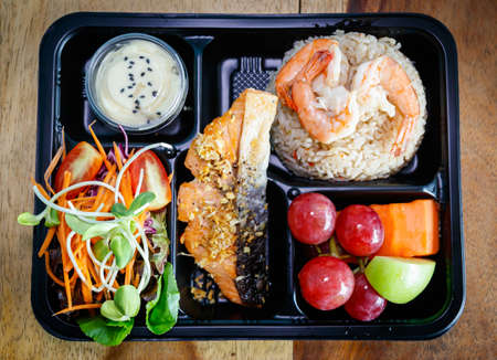 Foods series : Grilled salmon, served with rice berry and fresh vegetable in plastic box