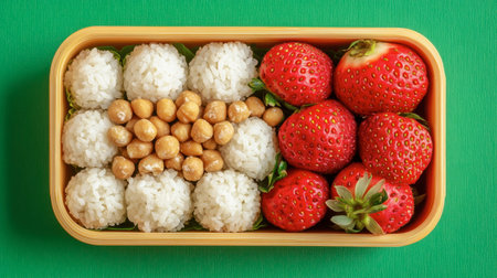 A vibrant bento box featuring rice balls, fresh strawberries, and crunchy nuts, ideal for meal prep and healthy snacking, showcasing a delightful color contrast.