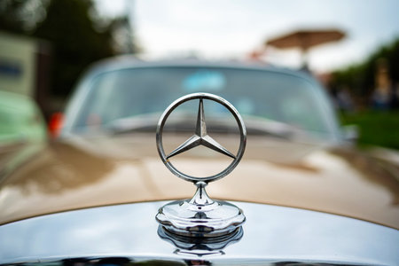 Bucharest, Romania - October 23, 2019: Illustrative editorial close up shot of the Mercedes Benz logo on a vintage car hood. Mercedes is a German car manufacturer.
