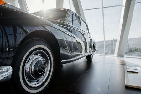 Mercedes Benz logo on a black vintage car. Close-up. Mercedes-Benz is a German automobile manufacturer. The brand is used for luxury automobiles, buses, coaches and trucks.