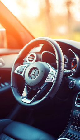 Luxury Car Interior Leather Steering Wheel, Dashboard Details, and Soft Bokeh Background