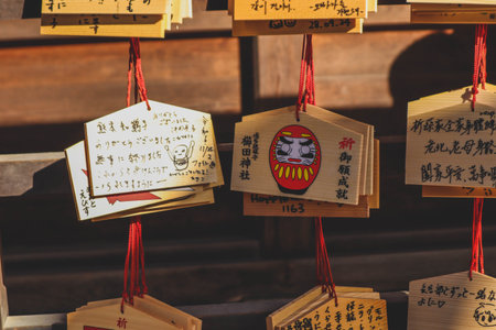 Fukuoka, Japan - August 31, 2014: Ema at Dazaifu Tenmang in Fukuoka. Ema are wooden that people write everything their wish. This is Ema in film tone.