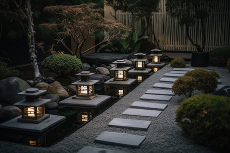 zen garden with lanterns and trickling water feature, created with generative ai