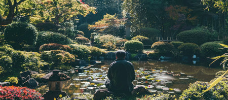 Japanese garden with pond and man sitting on the bench in Japan.