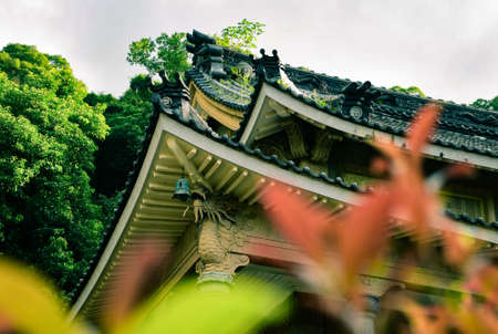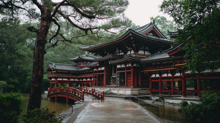 A tranquil Japanese temple nestled amidst vibrant greenery, showcasing exquisite architectural details and natural beauty, perfect for serene retreats.