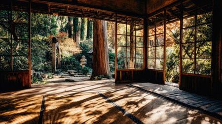 An interior space features large windows framing a vibrant forest scene. The sunlight filters through the trees, casting shadows on the wooden floor. The composition includes architectural elements of a traditional structure, creating a sense of peace and harmony. This image is suitable for various commercial uses, including promoting travel and wellness.