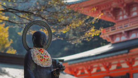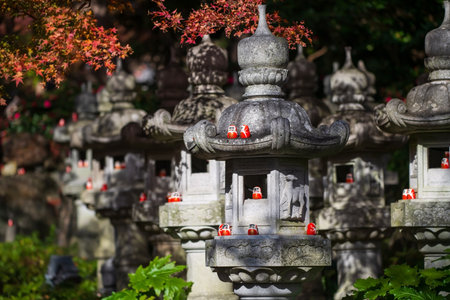 Daruma dolls decor on stone lantern at Katsuo-ji temple garden in autumn, Minoh, Osaka, Japan. travel destination for sightseeing Kansai in fall season.Temple of victory.