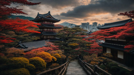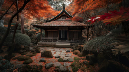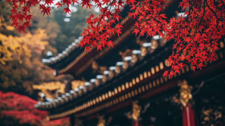 A peaceful scene of autumn maple leaves in front of a traditional Japanese temple. The red, orange and yellow foliage is illuminated by the warm sunlight. AI Generative.