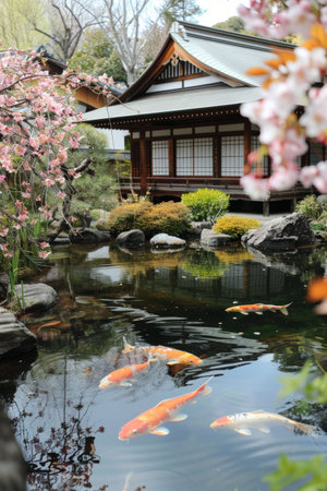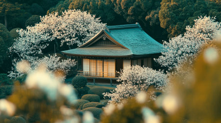 A tranquil Japanese garden showcasing a traditional wooden house nestled among blooming cherry blossoms, creating a picturesque and serene outdoor scene perfect for relaxation and reflection.