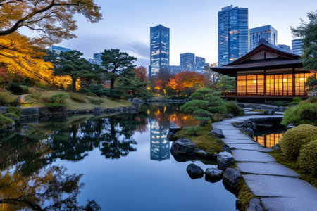 Tranquil scene of a traditional Japanese house by a pond reflecting the city lights at twilight in Tokyo