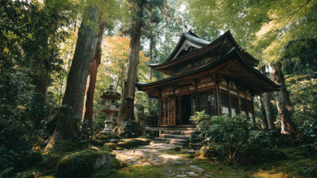 A beautiful Japanese temple nestled within a vibrant forest. The wooden structure is framed by towering trees and soft sunlight, creating a tranquil atmosphere perfect for meditation and peaceful reflection.
