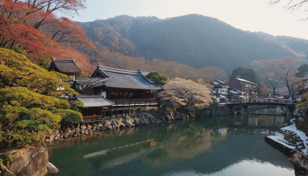 A serene Japanese landscape featuring traditional temples and village buildings surrounded by lush greenery and autumn colors, with a reflective river.