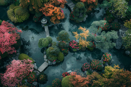 Aerial view of a serene Japanese garden featuring a traditional house surrounded by lush greenery and a tranquil pond, showcasing nature's beauty.