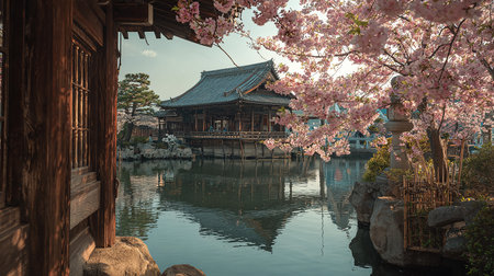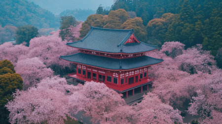 A stunning temple surrounded by vibrant pink cherry blossoms, creating a serene spring ambiance. Perfect for travel, nature, or architectural themes.
