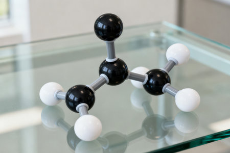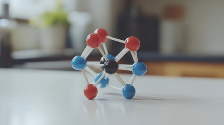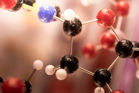 Molecular structure model with plastic atoms and bonds displayed on a white table in a lab