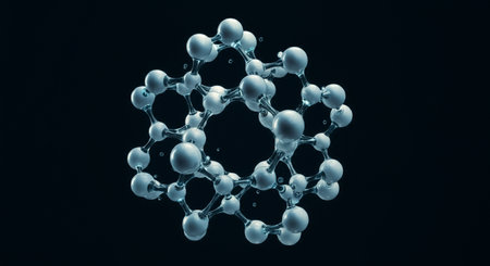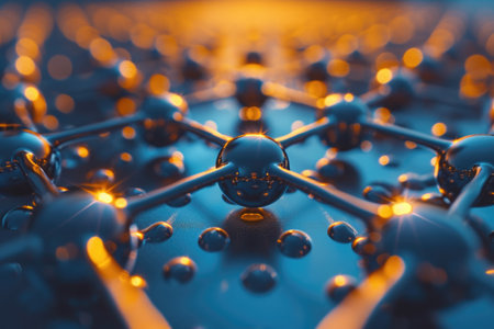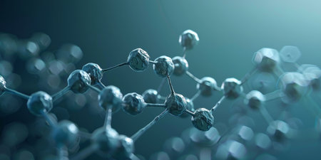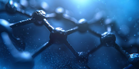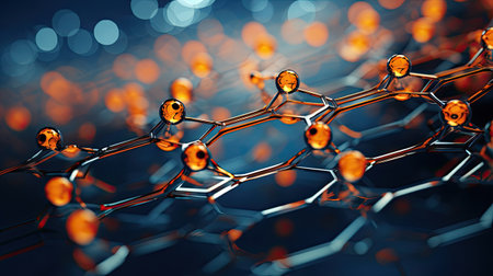 An abstract molecular structure is depicted, showcasing interconnected nodes against a dark backdrop. The image utilizes a focus on the structural forms, featuring a close-up perspective. This visual representation can be suitable for scientific illustrations, educational materials, or use in presentations. It is suitable for commercial and editorial purposes.