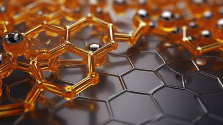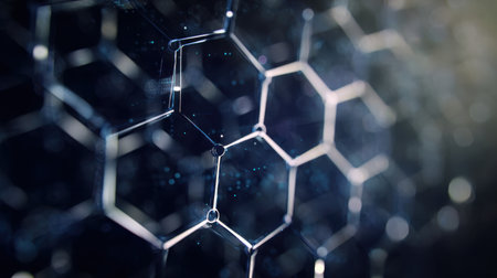 Explore an intricate abstract molecular structure featuring interconnected hexagons and glowing particles, symbolizing innovation and exploration in chemistry and biology.