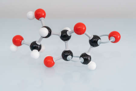Isolated vitamin C made by molecular model with reflection on white background. Ascorbic acid chemical formula with colored atoms and bonds.