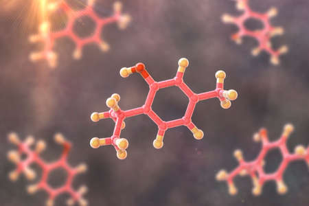 Thymol molecule, 3D illustration. Naturally occurring organic compound found in the thyme oil, has antiseptic properties
