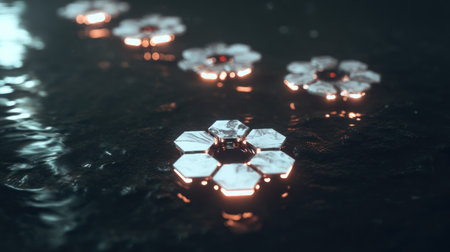 An abstract composition features a series of hexagonal shapes resembling flowers, arranged in a row. The elements are illuminated with a warm glow, creating a striking contrast against the dark background. The scene suggests a futuristic environment, offering potential use in design and illustration projects.