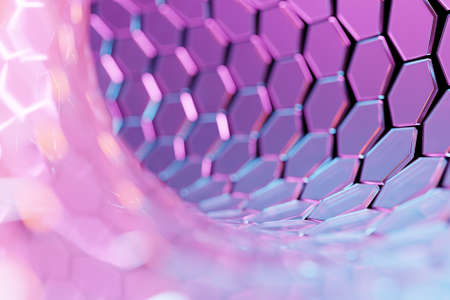 3D Rendering of nanotube structure, purple science background, technology concept, hexagonal geometric form close-up, graphene atomic structure