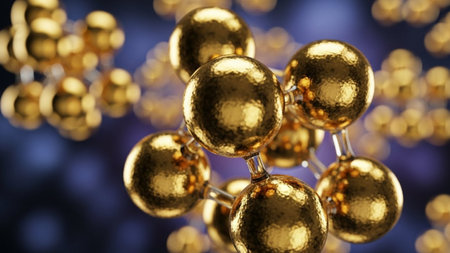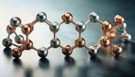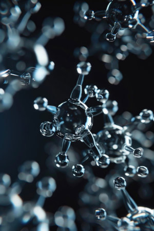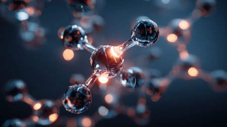 This image showcases a molecular structure composed of interconnected spheres and rods, set against a dark backdrop. The structure is rendered with a glossy appearance, highlighting the connection points. A bokeh effect in the background adds depth. Suitable for scientific publications, educational materials, or use in technology-related projects.