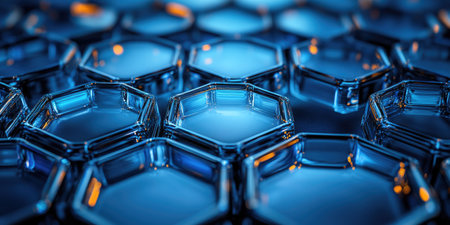 Intricate hexagonal glass pieces create a stunning visual effect with blue hues and reflections, arranged meticulously to enhance their geometric beauty and play with light.