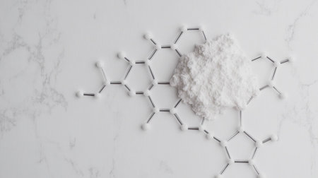 White powder on a marble background representing a pharmaceutical concept illustrating chemical structure and health care
