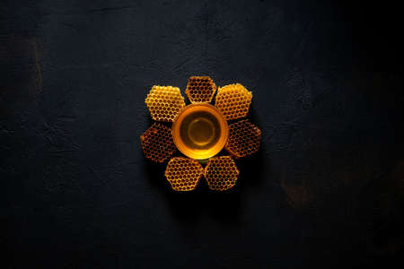 Honey and honeycomb in the form of a flower on black table, top view. space for text.