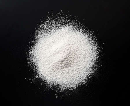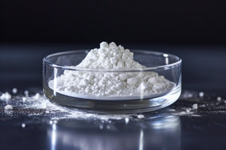 Close-up of a mound of fine white powder in a transparent dish, isolated on a dark surface