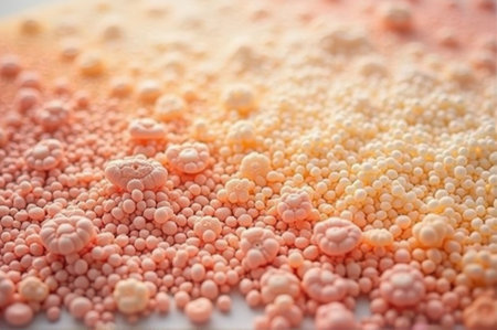 Colorful seashell-shaped candy beads in warm pastel hue gradient. That the image is generated using AI.