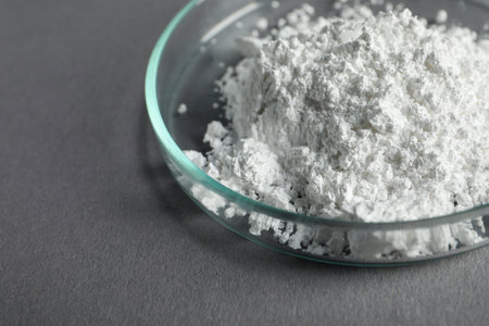 Titanium dioxide powder, TiO2 in Petri dish on dark stone table, top view. Food coloring, E171. Pigment has a wide range of applications, including paint, food, toothpastes, and cosmetic products.